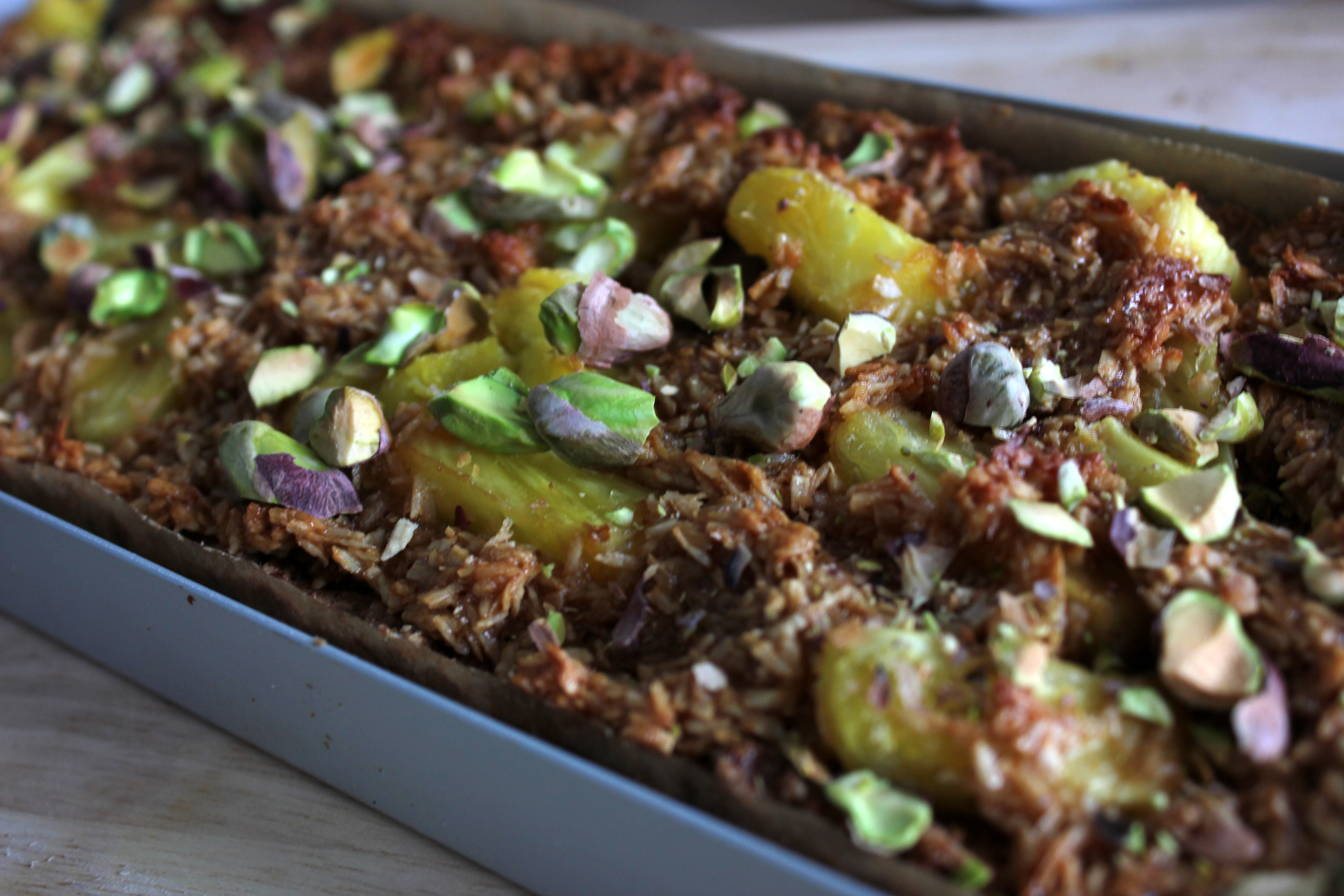 So here is what I had in mind for a hearty, warm and satisfying sweet treat while avoiding the sugar rush . Shredded coconut to resemble the snow, spelt flour and coconut sugar for the earthy notes inspired from the tree leaves, pineapple for the dreaminess, pistachios for the extra hidden crunch, and finally a warm hint of cardamom to make it extraordinary.