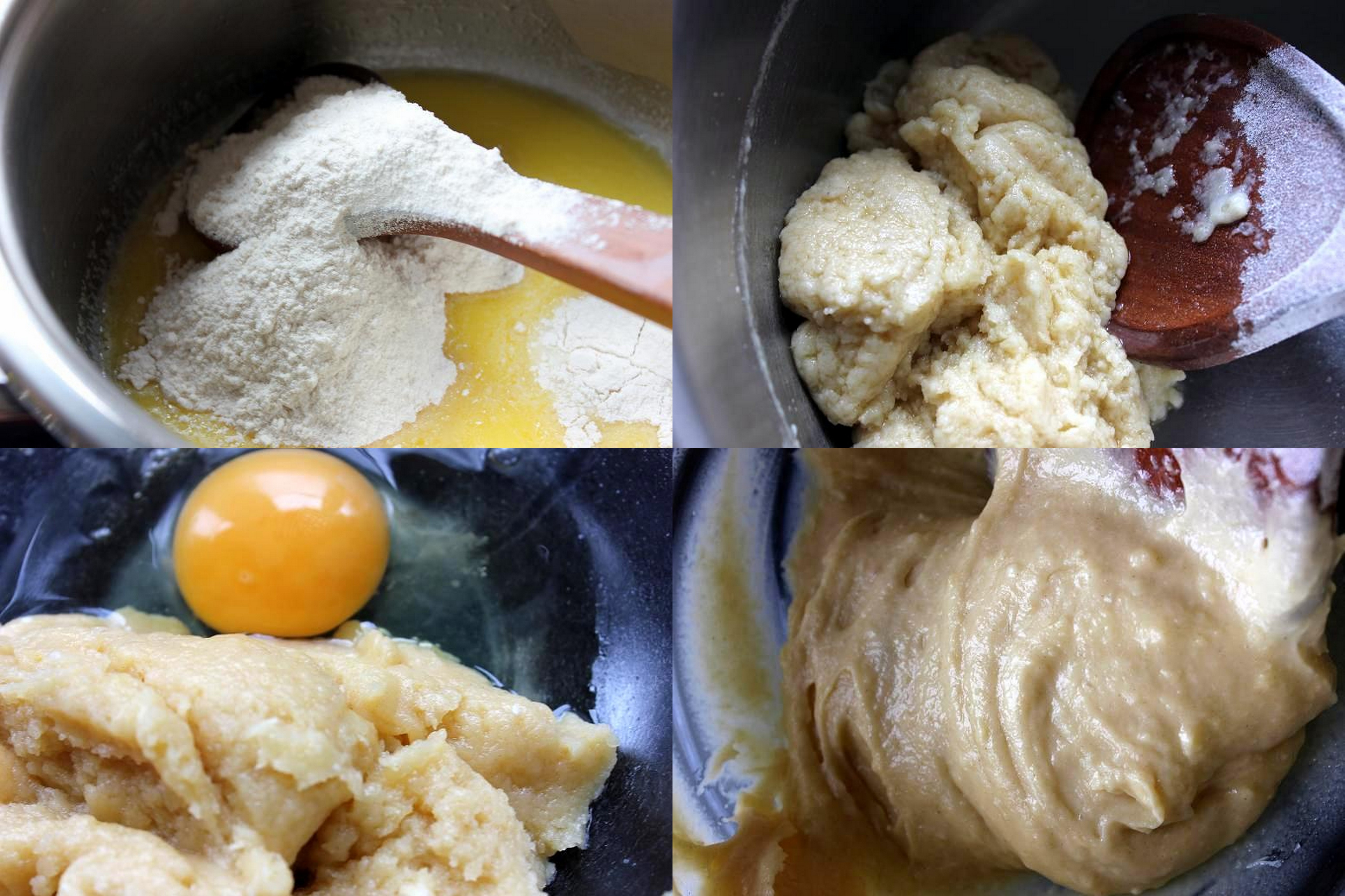 Tip into a bowl, and then add the eggs one by one, beating with a wooden spoon or with an electric beater. Please do not add the eggs to the pan that has just been removed from the heat because you will end up with scrambled eggs. Trust me I’ve been there. You want the dough to be at the right temperature so don’t delay adding the eggs for too long.