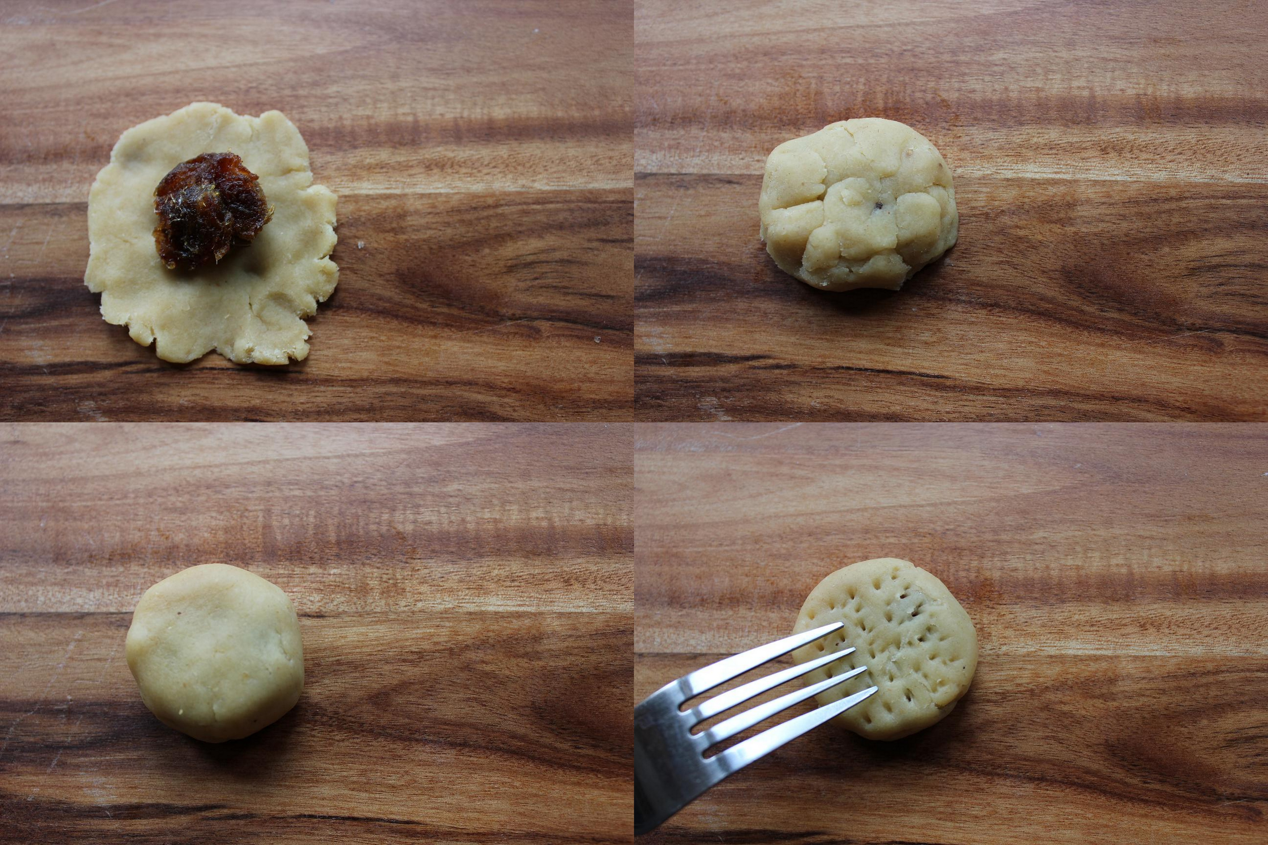 Break off small walnut sized pieces of the dough, flatten and fill with about 1 teaspoon of the date filling. Close the filling and press into the cookie mould or create your own pattern using the back of a fork. Repeat until all the dough and date filling is used up.