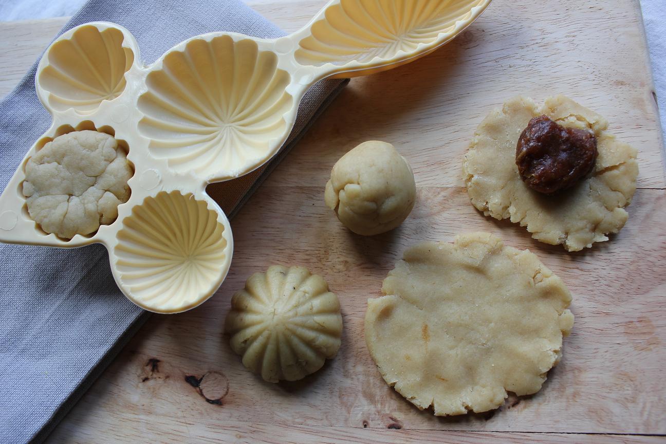 I should also mention that you need a cookie mould (i.e. ma’moul mould) to shape the stuffed cookies into the delicacies shown above and below. However, if you don’t have any ma’moul mould you could either turn them into date rolls, or create your own pattern with a fork. The choices are endless. The cookie mould that I have used pictured above is not the authentic wooden one most commonly used, but it still does the job! No matter what shape or size, you are warned, these cookies are extremely ‘more’ish’ and addictive.