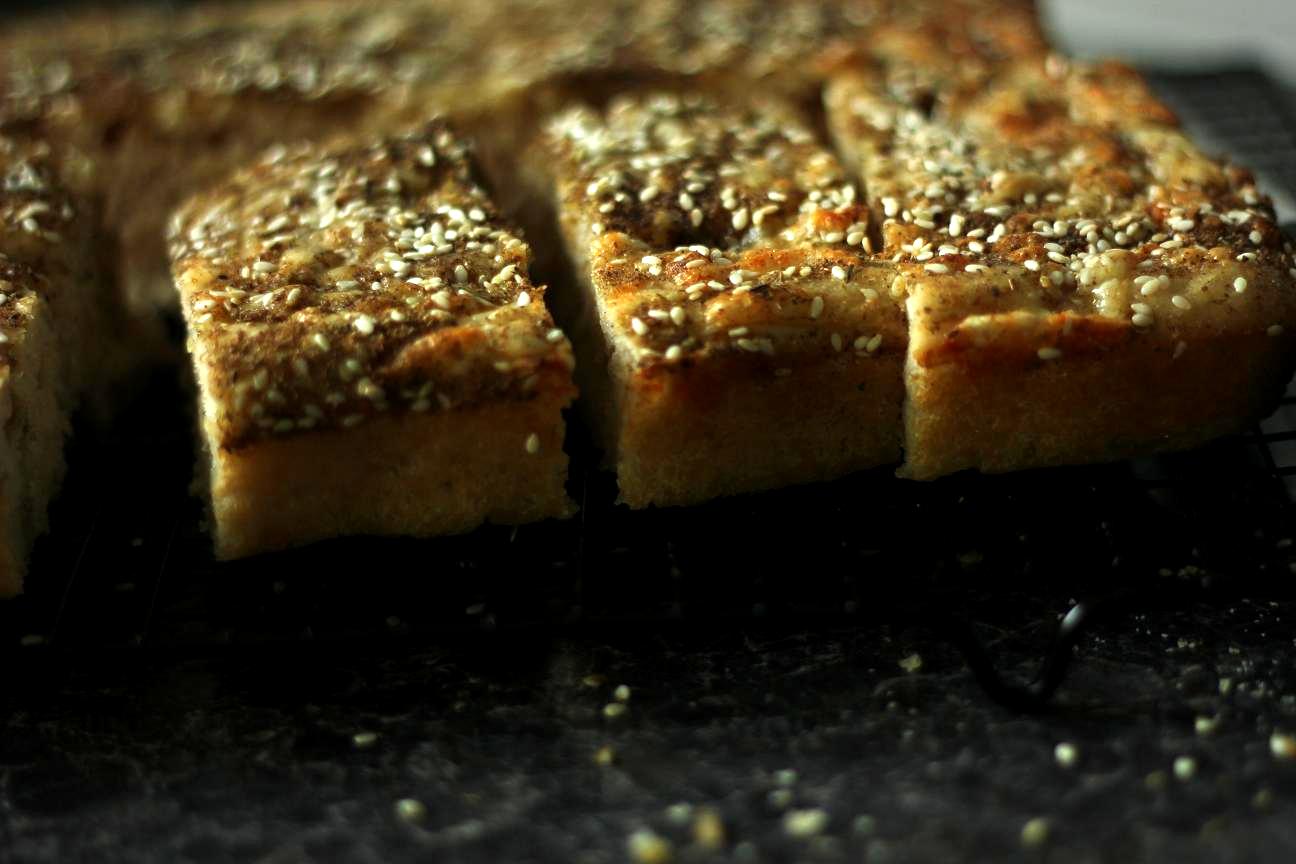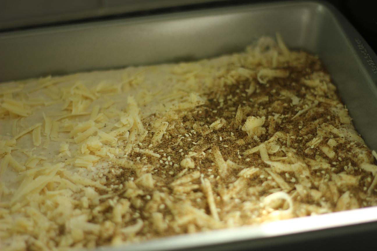 Preheat the oven oven to 200°C for at least 15 minutes. Meanwhile sprinkle the risen dough in the baking tray with cheddar cheese if using, followed by the za’tar. If you don’t like this combo, then top the dough with whatever you fancy.