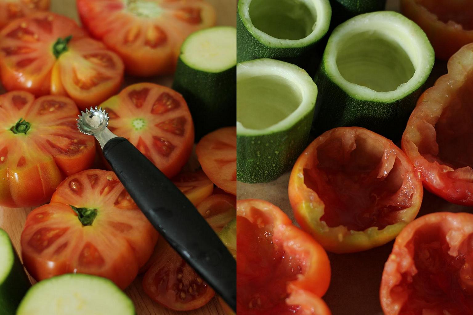 Use a serrated knife to cup the top 10 per cent from each tomato. For the courgettes, cut into a few segments, the same length of the tomatoes, trimming the ends. Working over a bowl, use a spoon or a tool to scoop the flesh from each tomato, letting the juice and tomato chunks fall into the bowl. For the courgettes, scoop out enough flesh to leave a thin layer of pith to hold the stuffing. Do your best to avoid piercing the walls of the tomatoes and courgettes. Use your hands to break up any large chunks of carved-out tomato flesh. You can use the courgette flesh to make courgette bread. Arrange the tomato and courgette ‘shells’ in the prepared baking dish, and sprinkle some sea salt.