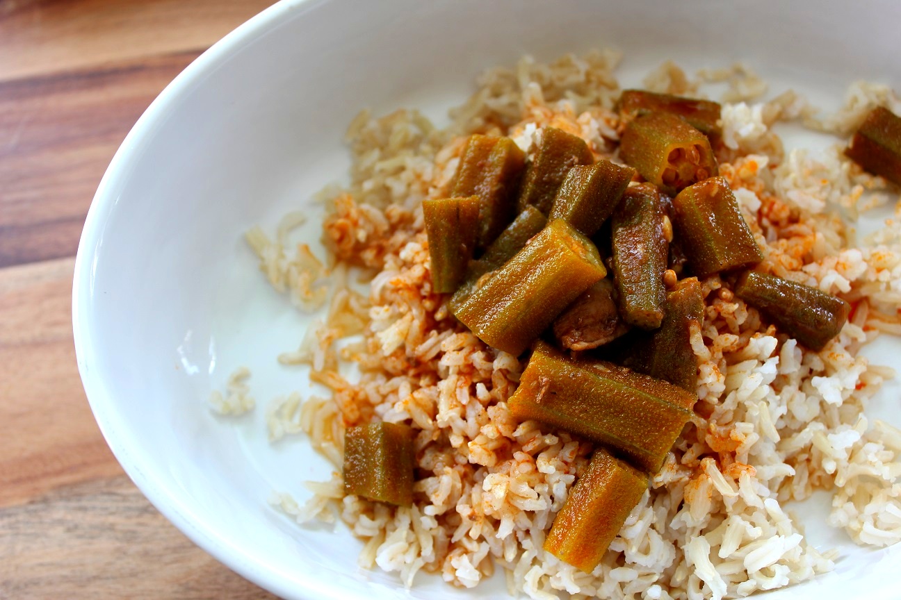 Iraqi Okra StewMy 5 year old daughter is wearing her finest outfit, a long dress made with semi-sheer chiffon, elegantly draped over the spring-green silk lining. The stunning green floral print is perfectly contrasted with a crimson pleated waistband tied at the back. I get a glimpse of her shyly making new friends with the local children, mixing in the odd English word with the dominantly Arabic conversation. I scan the place looking for my eldest children, but they are not to be seen.